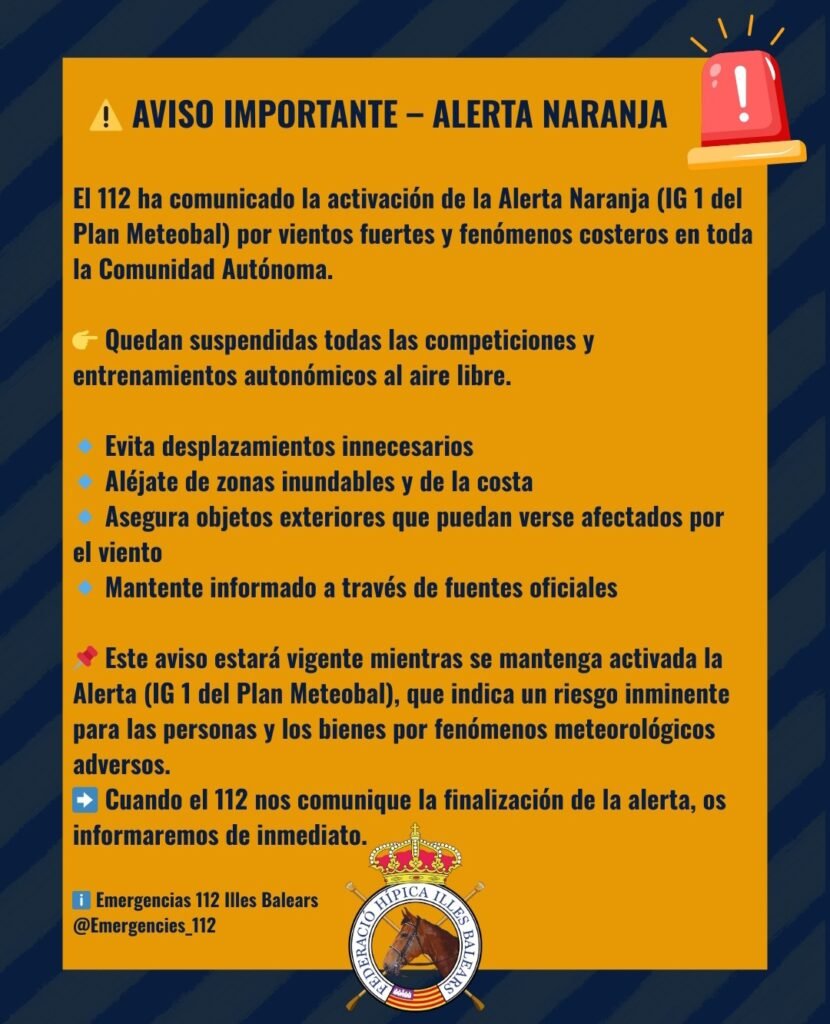 El servicio de emergencias 112 ha comunicado la activación de la Alerta Naranja (IG 1 del Plan Meteobal) en toda