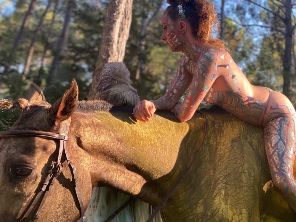 Quien quiera ver un body painting de verdad, que admire el de nuestra amiga María Ramón, amazona y entrenadora ibicenca. El artista Johny Dar la usa de lienzo, acompañada por caballos. Sí, el caballo es una estampa que a todo el mundo le gusta, monte o no.
