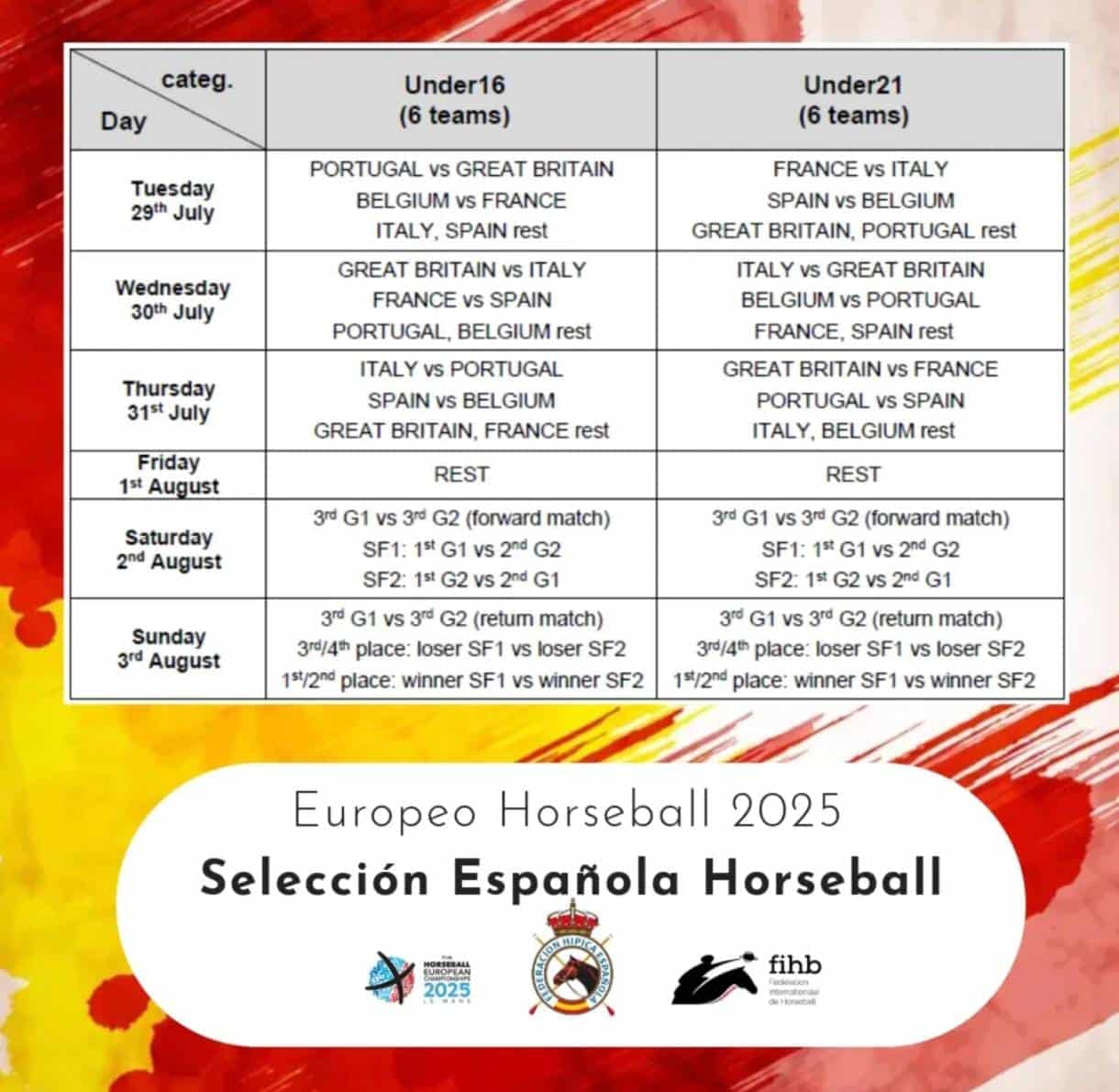 A finales del mes de julio dará comienzo al Campeonato de Europa de Horseball 2025 tanto para la categoría Sub21 como para Sub16 y es el siguiente: