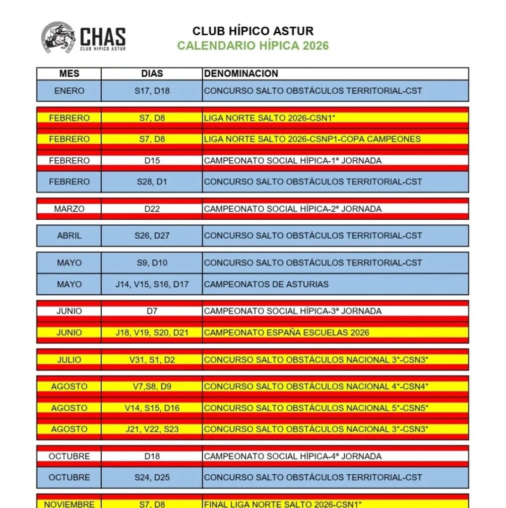 El Club Hípico Astur ha dado a conocer su calendario provisional para la temporada 2026, con una ambiciosa programación que