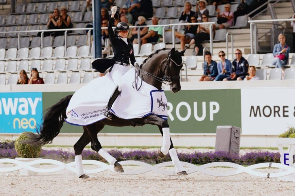 La música de la película «Free Willy» fue el acompañamiento perfecto para la coreografía de Freestyle de Veronica Pawluk y su yegua criada en Oldemburgo, Fallete OLD. El binomio lleva casi un año siendo compañeros de equipo. La joven de 17 años corre para Polonia, pero reside en Düsseldorf. Es su primera vez en el CHIO Aachen. ¿Nerviosa? Al menos no hasta el punto de afectar su rendimiento. «Me divertí mucho montando en la Freestyle. El ambiente en el estadio es indescriptible y simplemente quería disfrutarlo», comentó más tarde. No fue la única que lo disfrutó, los jueces también. Como penúltimo binomio en la clasificación, Pawluk y Fallete desbancaron a la hasta entonces líder al segundo puesto con una puntuación del 75,795%.