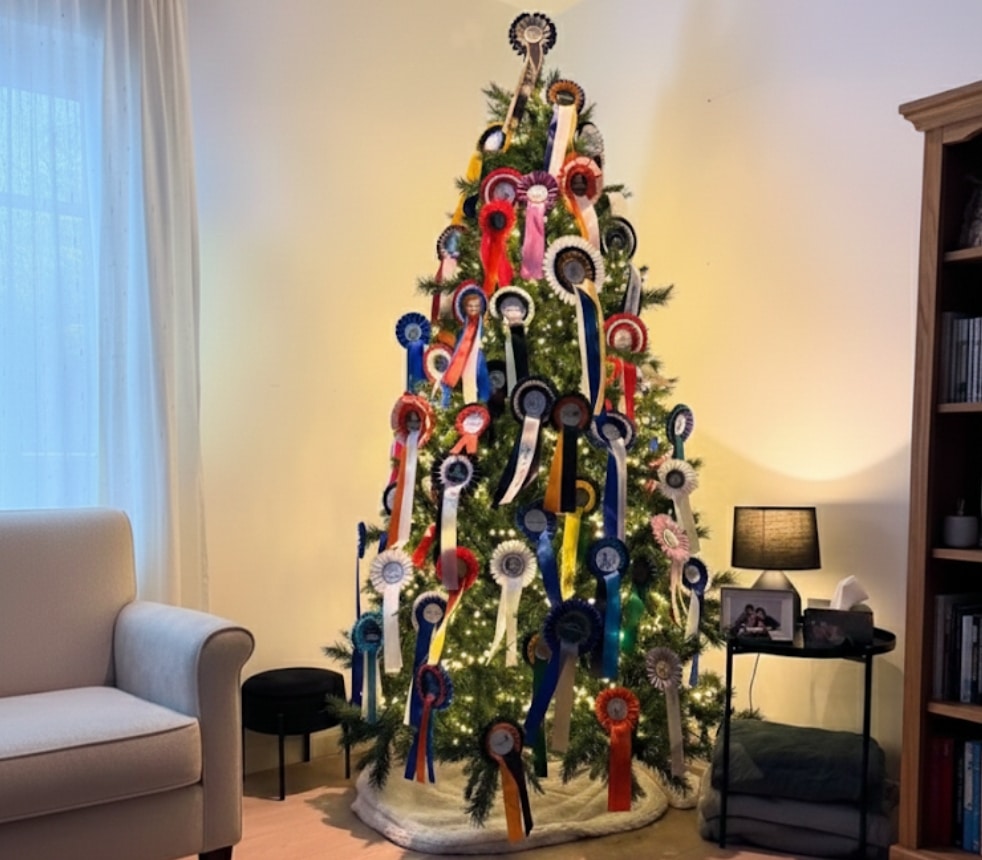 No solo el árbol lleno con las escarapelas de los últimos campeonatos ganados, sino que esas escarapelas se pueden unir, por ejemplo a siluetas de caballos, recortadas en cartón y pintadas por los más jóvenes de la hípica.
