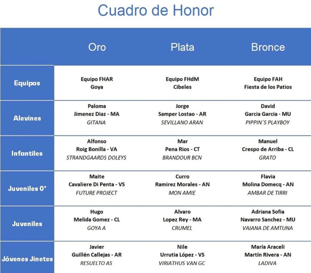 En la clasificación por equipos, tal y como os contamos en anteriores artículos, el oro recayó en el conjunto FHAR con Goya, mientras que la plata fue para el equipo FHdM con Cibeles y el bronce para el FAH con Fiesta de los Patios.
