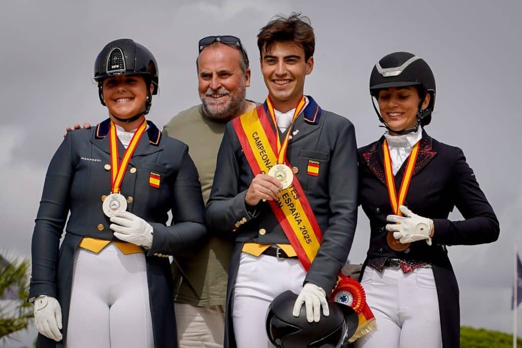 Vejer, 28 de septiembre de 2025. El aragonés Javier Guillén Callejas con su entero castaño de trece años Resuelto AS, hijo de Barquero XXVI propiedad de Gonzalo Guillén Pueyo, se ha proclamado vencedor del Campeonato de España de Doma Clásica Jóvenes Jinetes tras una brillante actuación en las dos calificativas y una impresionante Kür en la que ha conseguido un 72.14% de media. En total, ha acumulado 215,258 puntos, consiguiendo una ventaja de ocho puntos en la clasificación que lo han catapultado a lo más alto del podio.