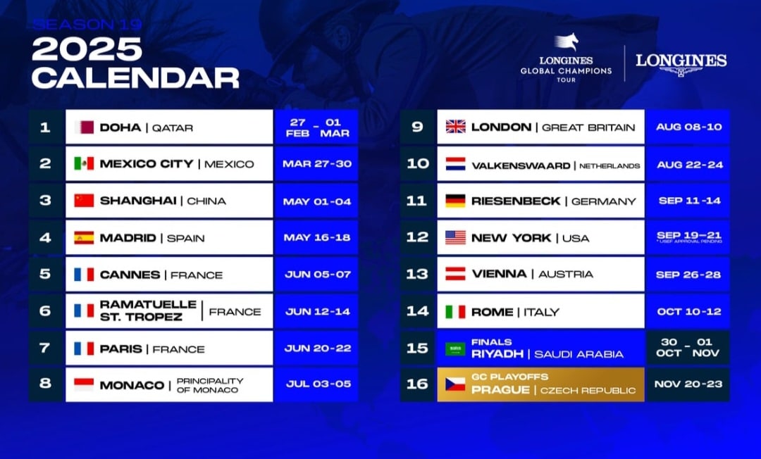Ya se ha anunciado el calendario oficial de la temporada 2025 del Longines Global Champions Tour y la Global Champions League, donde los mejores jinetes y equipos del mundo se preparan para una temporada llena de emoción, compitiendo en algunos de los escenarios más icónicos del circuito ecuestre.