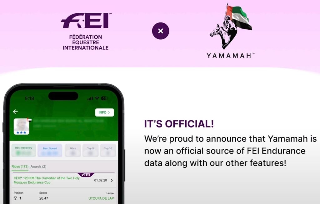 La Federación Ecuestre Internacional ha anunciado una nueva alianza con Yamamah App, una aplicación móvil ampliamente utilizada en la comunidad de Raid y reconocida por ofrecer datos en tiempo real sobre competiciones de todo el mundo. La herramienta, creada por el emprendedor y jinete Rashid Al Abbar, se ha convertido en un recurso esencial para seguir eventos en directo y consultar información clave del deporte.