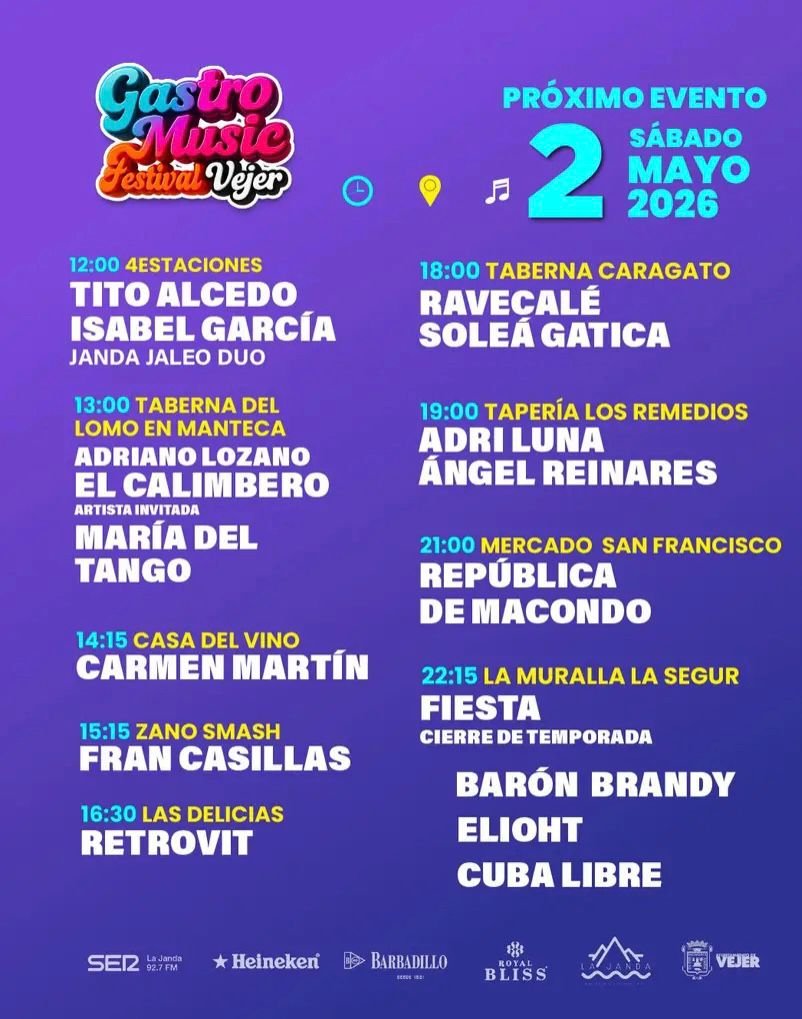 Con esta propuesta, Gastro Music Vejer continúa apostando por destacar espacios únicos del municipio, situando a Las Delicias como un auténtico referente dentro de una jornada que promete música, sabor y mucho ambiente.