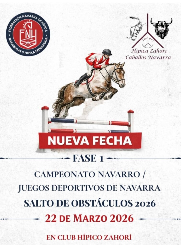 La primera fase del Campeonato Navarro y los Juegos Deportivos de Navarra de Salto de Obstáculos 2026 ya cuenta con una nueva fecha oficial tras el aplazamiento provocado por las condiciones meteorológicas adversas. La Federación Navarra de Hípica y el Club Hípico Zahorí han confirmado que la competición se celebrará finalmente el domingo 22 de marzo de 2026, una decisión adoptada después de analizar cuidadosamente todas las alternativas disponibles en el calendario.