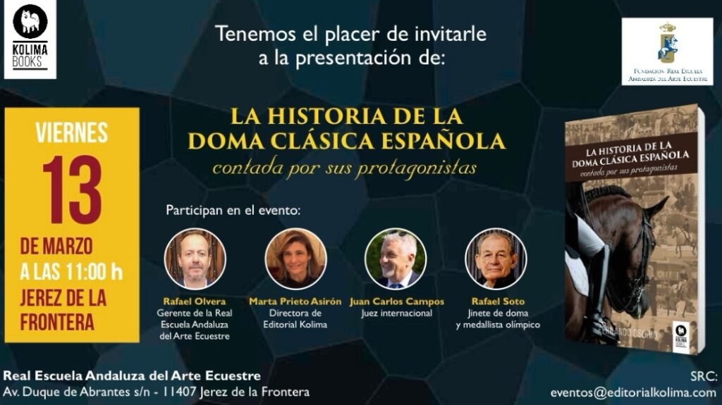 El acto contará con la participación de Rafael Olvera, gerente de la Real Escuela Andaluza del Arte Ecuestre; Marta Prieto Asirón, directora de Editorial Kolima; Juan Carlos Campos, juez internacional; y Rafael Soto, jinete de Doma Clásica y medallista olímpico.