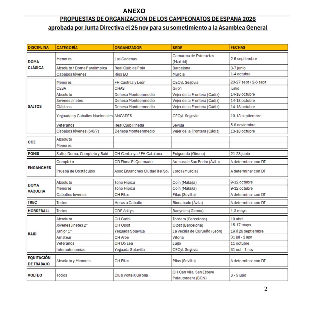 Tras la reunión que la Junta Directiva de la Real Federación Hípica Española mantuvo el martes 25 de noviembre, quedaron definidas las propuestas de sedes para los Campeonatos de España de 2026, que deberán ser validadas ahora por la Asamblea General.