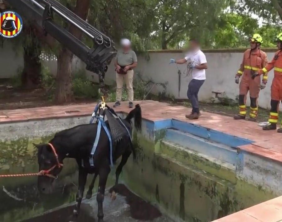En una complicada operación de rescate, los bomberos del Consorcio de Valencia lograron salvar a un caballo que había caído en una piscina en la localidad de Bétera, en la Comunidad Valenciana. La rápida acción de la propietaria y algunos veterinarios evitó que el animal se ahogara, manteniendo su cabeza fuera del agua hasta la llegada de los bomberos.